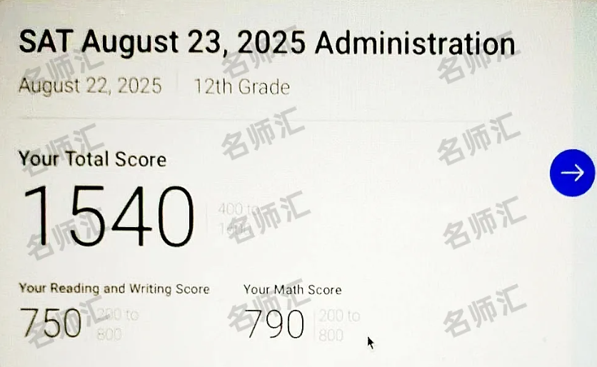 备考SAT的过程中,我很幸运地遇到了名师汇的各位老师。通过这段时间的一对一学习,我的英语能力和应试技巧有了明显提升,在8月考试如愿取得了1540分的满意成绩。