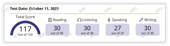 大家好,我是来自四中国际校区高三的王海博。在最近一次托福考试中,我终于拿到了117分(R30、L30、S27、W30)的满意成绩。