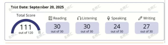 后来6月份我也考了两次,前两科发挥都不错,但后两科总卡在23分左右。进入暑假,7月份个人比较忙,花在托福的时间有限,而且主要都在练口语和写作。7月底又考了一次,结果前两科只拿了26分、27分,总分不用说也知道不太好。于是8月我专门抽了一整个月学习托福,每天开始前都会先规划好当天的任务,四科都兼顾到,然后按计划完成。练了一段时间阅读和听力后,前两科基本能稳定在29-30分。终于在9月份开学后,我考出了111分的托福成绩。