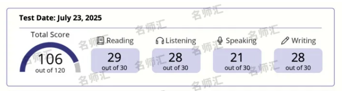 大家好!我是来自西城区北师大实验中学国际部的新高一学生张睿修,初中毕业于朝阳区陈经纶中学嘉铭分校。中考结束后,我便全身心地投入到托福备考之中,在名师汇接受了十多天的系统培训和考前冲刺后,最终取得了106分的好成绩。这份满意的答卷,离不开名师汇这个温暖的集体,我将其归因于以下四个关键方面~
