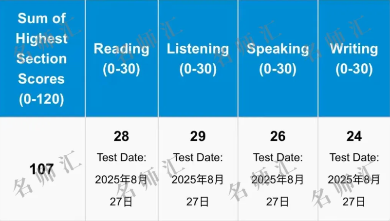 大家好,我是张妙颜,现在9年级,很开心我的托福成绩能在短短20天里,从之前的92分提升到现在的107分。这15分的突破离不开名师汇系统化的训练体系,更得益于名师汇老师们全程专业且细致的针对性指导,帮我高效攻克薄弱项,最终拿下理想分数!