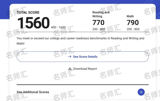 总而言之,备考SAT的过程对我而言不仅是一次成绩的提升,更是一次学习能力的成长。在这一过程中,我学会了如何制定合理的学习计划,如何高效地解决问题,如何在面对困难时调整心态。这些成长背后,离不开名师汇老师们的辛勤付出。他们不仅拥有专业的知识和丰富的教学以及实考经验,更懂得如何引导学生发现自身的问题并激发学习潜力。在我遇到瓶颈时,他们耐心地为解答疑惑;在我取得进步时,他们及时地给予鼓励。正是来自老师们的这份专业与用心,让我首考SAT就取得了1560分的好成绩。